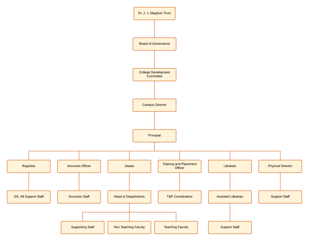 At Dr. J. J. Magdum College of Engineering (JJMCOE), our organizational structure is crafted to support a culture of academic excellence, innovation, and student success. This chart showcases the dedicated leadership and faculty members who drive our mission to empower future engineers, guiding them to become skilled professionals and responsible leaders. Explore our team and learn about the roles that bring our vision to life.
